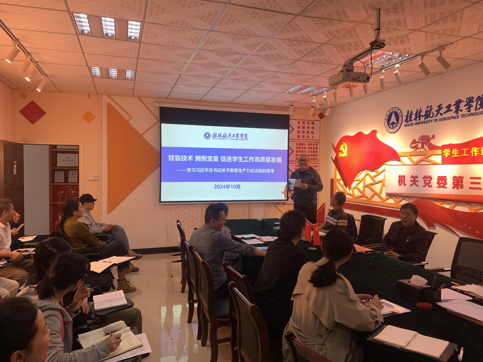 10月31日上午,pa集团官网第三党支部开展了以“支部党课我来讲”为主题的特色党日活动。党支部统战委员从“背靠技术,拥抱变量,促进学生工作高质量发展”的角度,分享了学习习近平总书记关于新质生产力的相关论述后的思考。